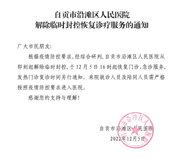 自贡市沿滩区人民医院解除临时封控恢复诊疗服务的通知